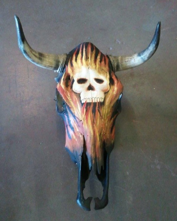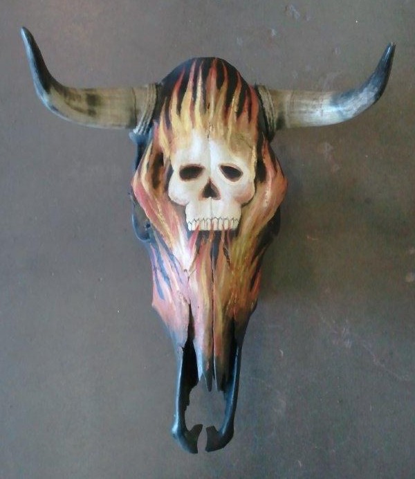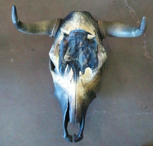 Hand painted fighting bull skull